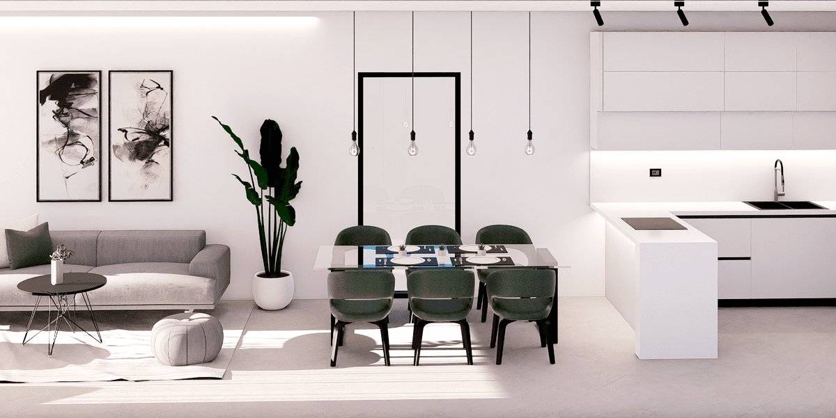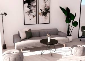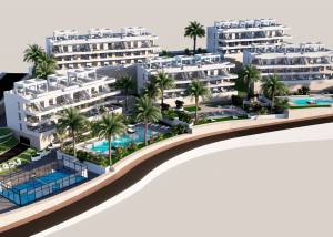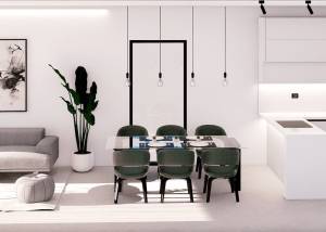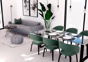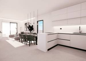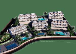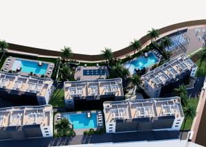 Das Innere der Wohnungen ist sorgfältig gestaltet, um Komfort und Modernität zu bieten. Die Apartments, Erdgeschosswohnungen und Penthäuser verfügen über Feinsteinzeugböden, die einen eleganten Touch verleihen und pflegeleicht sind. Alle Immobilien sind mit Klimaanlagen ausgestattet, die das ganze Jahr über ein angenehmes Ambiente gewährleisten. Einbauschränke bieten viel Stauraum, während die Video-Gegensprechanlage ein zusätzliches Maß an Sicherheit und Komfort bietet. Die Aufteilung umfasst zwei Schlafzimmer und zwei Badezimmer, die den Bedürfnissen verschiedener Familientypen gerecht werden.