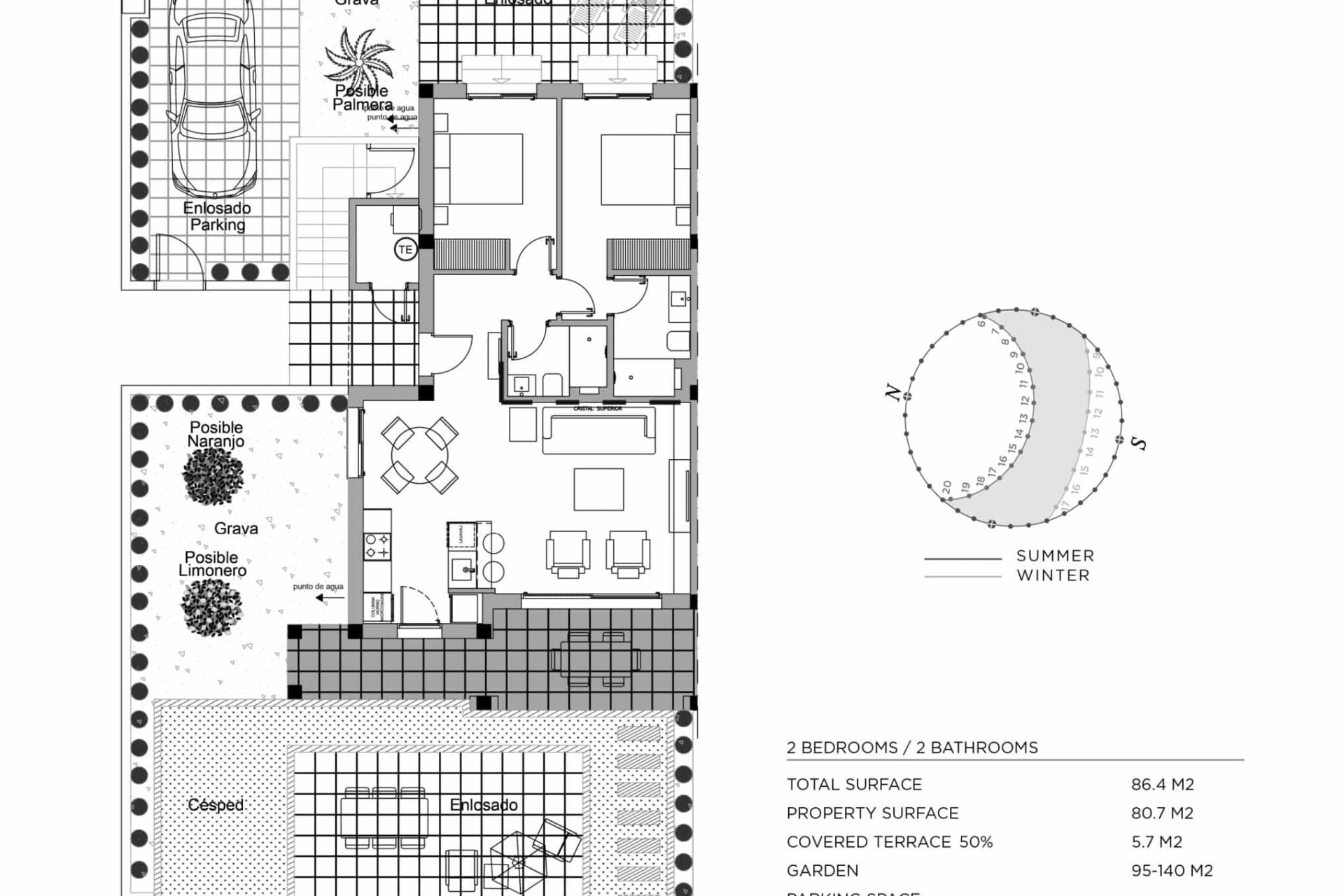 Das Innere der Bungalows ist sorgfältig gestaltet, um Komfort und Stil zu bieten. Mit zwei Schlafzimmern und zwei Bädern ist jeder Raum auf Komfort optimiert. Die Feinsteinzeugböden verleihen einen modernen Touch und sind pflegeleicht. Elektrische Rollläden und Einbauschränke sind Standardmerkmale, die die Funktionalität des Hauses verbessern. Darüber hinaus sorgt die Vorinstallation der Klimaanlage dafür, dass das Raumklima immer angenehm ist. Die Aufteilung umfasst eine Garage, die einen sicheren Platz für das Fahrzeug bietet.