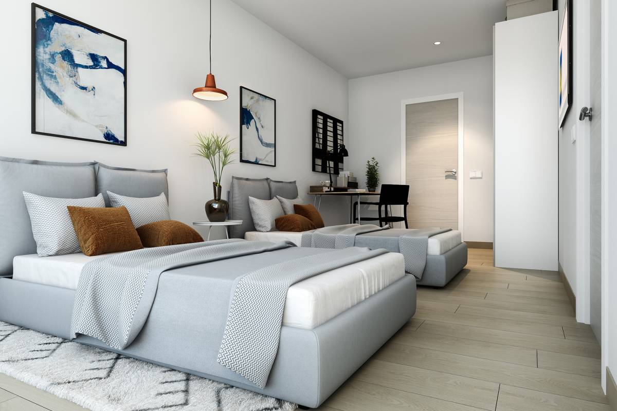The exterior design of these homes in Dénia stands out for its integration with the natural environment. Each property has a private garden, ideal for enjoying the Mediterranean climate. Additionally, terraces and solariums offer additional outdoor spaces, allowing residents to enjoy unobstructed views and moments of relaxation. The presence of a private pool in each home adds a touch of exclusivity, turning the home into a personal oasis. The communal landscaped areas complement the environment, providing a shared green space for all residents to enjoy.
