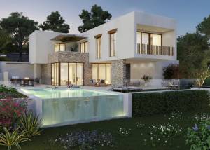 The exterior of the villa is designed to maximize enjoyment of the Mediterranean climate. It features a beautiful garden that offers a private green space for relaxation or outdoor activities. The terrace is perfect for al fresco dining or simply enjoying the views and natural surroundings. Additionally, the villa includes a private pool, ideal for cooling off during warm summer days and enjoying leisure moments with family or friends.