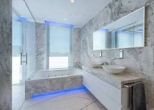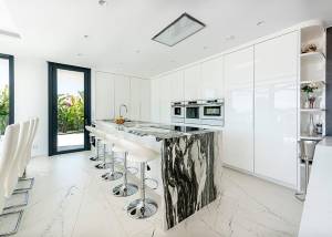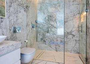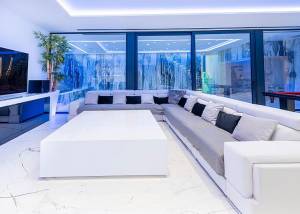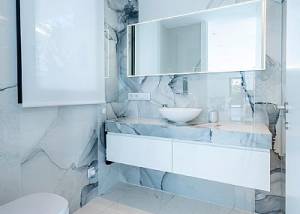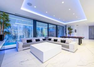 The villa's interior is equipped with luxury features that ensure maximum comfort. Marble floors add a touch of elegance, while the underfloor heating system ensures a pleasant temperature year-round. The villa is fully furnished and equipped with high-end appliances, making for a hassle-free move. Electric shutters and the home automation system provide additional convenience and security. Additionally, air conditioning ensures a cool and comfortable environment during the warmer months. Built-in wardrobes in the bedrooms offer ample storage space.