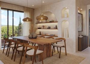 The exterior of the villa is designed to make the most of the Mediterranean climate. It features a private garden that offers a green space ideal for relaxation or enjoying outdoor activities. The presence of a pergola provides a shaded area perfect for outdoor dining or moments of rest. Additionally, the villa has a private pool, a luxury that allows you to cool off on the hottest days and enjoy leisure moments with family or friends. The terrace is another of the outdoor attractions, with its barbecue and covered terrace that acts as an extension of the dining room, giving the family additional space to enjoy the sun and views of the natural surroundings.