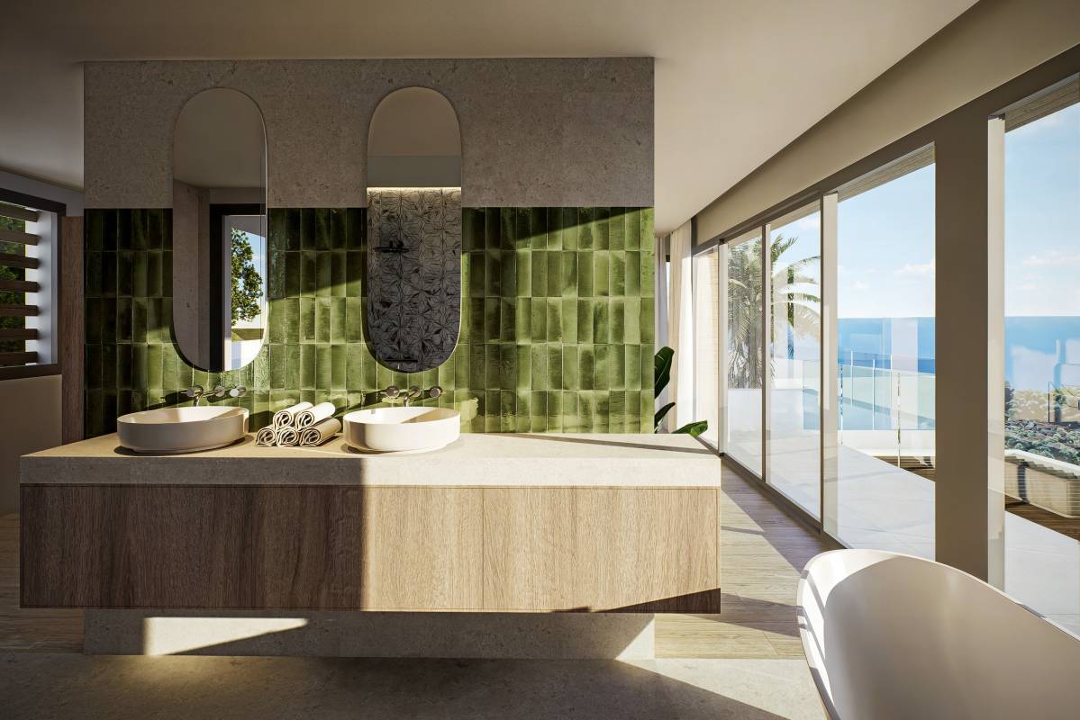 El exterior de la villa está diseñado para maximizar el disfrute del clima mediterráneo. Cuenta con un jardín privado que ofrece un espacio verde perfecto para el relax o para actividades al aire libre. La terraza es un lugar ideal para disfrutar de las vistas al mar y de las puestas de sol. Además, la villa dispone de un solárium, perfecto para tomar el sol en total privacidad. La piscina privada es otro de los atractivos de esta propiedad, proporcionando un espacio refrescante para los días más calurosos.