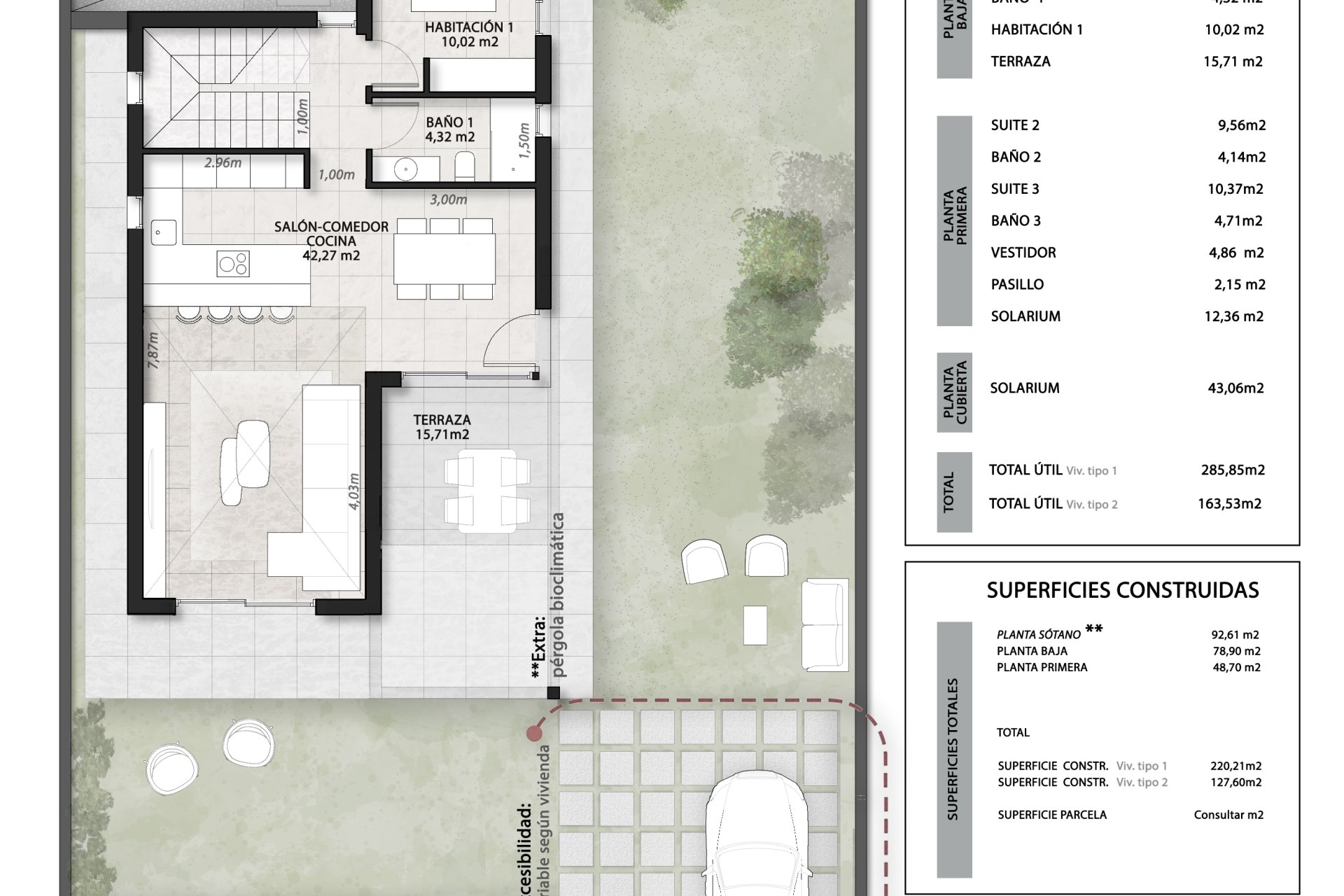 Los exteriores de estas viviendas independientes en Finestrat están pensados para disfrutar del clima mediterráneo. Cada propiedad cuenta con un jardín privado y una terraza, ideales para momentos de relax al aire libre. Además, disponen de un solárium que ofrece un espacio adicional para disfrutar del sol y las vistas panorámicas al mar. La presencia de una piscina privada en cada vivienda añade un toque de lujo y exclusividad, permitiendo disfrutar de un refrescante baño en la privacidad de tu hogar. Las pérgolas complementan el diseño exterior, proporcionando sombra y un espacio acogedor para reuniones al aire libre.