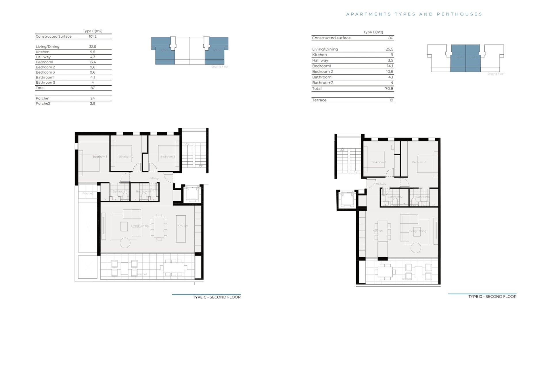 El interior de estas viviendas está cuidadosamente diseñado para ofrecer comodidad y modernidad. Los apartamentos, plantas bajas y áticos están disponibles en configuraciones de 2 y 3 dormitorios, todos con 2 baños. Las cocinas están completamente equipadas con electrodomésticos modernos, y las viviendas vienen amuebladas, listas para entrar a vivir. El sistema de climatización incluye aire acondicionado y calefacción por suelo radiante, asegurando confort durante todo el año. Los suelos de cerámica y gres porcelánico aportan un toque de sofisticación y son fáciles de mantener. Las persianas eléctricas y el videoportero añaden un nivel extra de comodidad y seguridad.