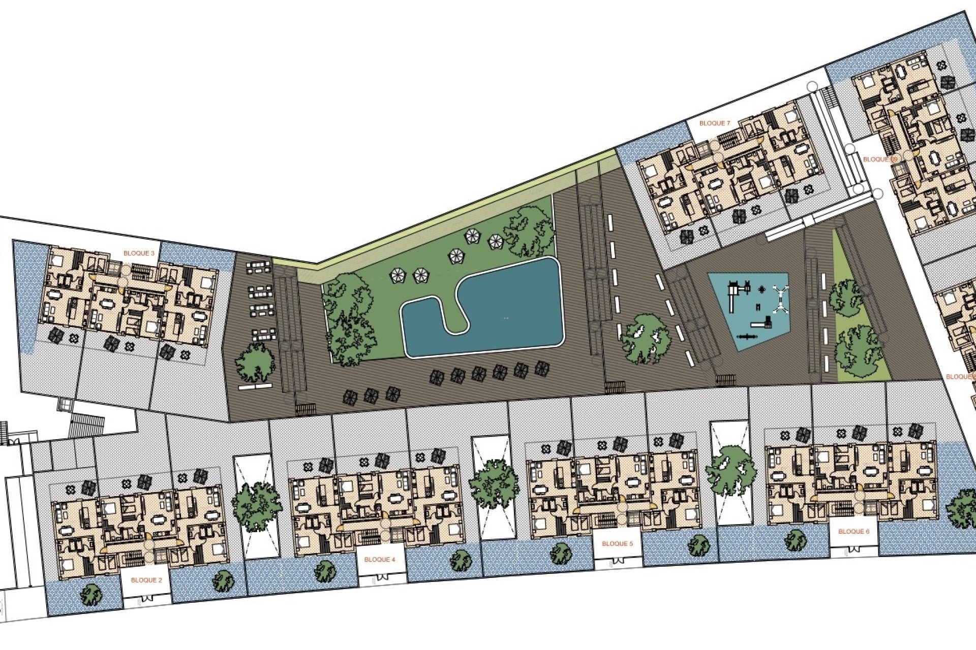 El interior de las viviendas está diseñado con un enfoque en el confort y la funcionalidad. Todas las propiedades están completamente amuebladas y equipadas con electrodomésticos modernos. Los suelos de gres porcelánico aportan un toque de elegancia y durabilidad. Los armarios empotrados ofrecen un almacenamiento eficiente, mientras que el aire acondicionado garantiza un ambiente agradable en cualquier estación. Con una distribución que incluye dos dormitorios y dos baños, estas viviendas están pensadas para satisfacer las necesidades de cualquier familia.