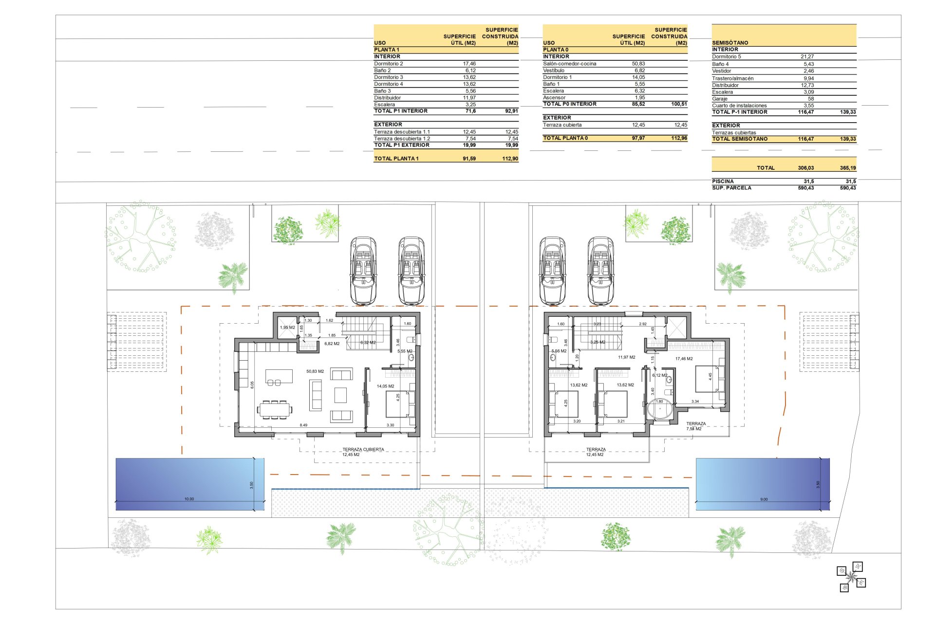 El interior de las villas está cuidadosamente diseñado para ofrecer el máximo confort y funcionalidad. Con cinco dormitorios y cuatro baños, estas propiedades son perfectas para familias o para recibir invitados. La distribución incluye un garaje, asegurando espacio para estacionamiento y almacenamiento. Los acabados de alta calidad incluyen suelos de gres porcelánico, que aportan durabilidad y un estilo moderno. Las villas están equipadas con electrodomésticos de última generación, domótica para un control eficiente del hogar, aire acondicionado para mantener una temperatura agradable durante todo el año, y calefacción por suelo radiante para los meses más fríos. Los armarios empotrados ofrecen un amplio espacio de almacenamiento, manteniendo el diseño interior limpio y ordenado.