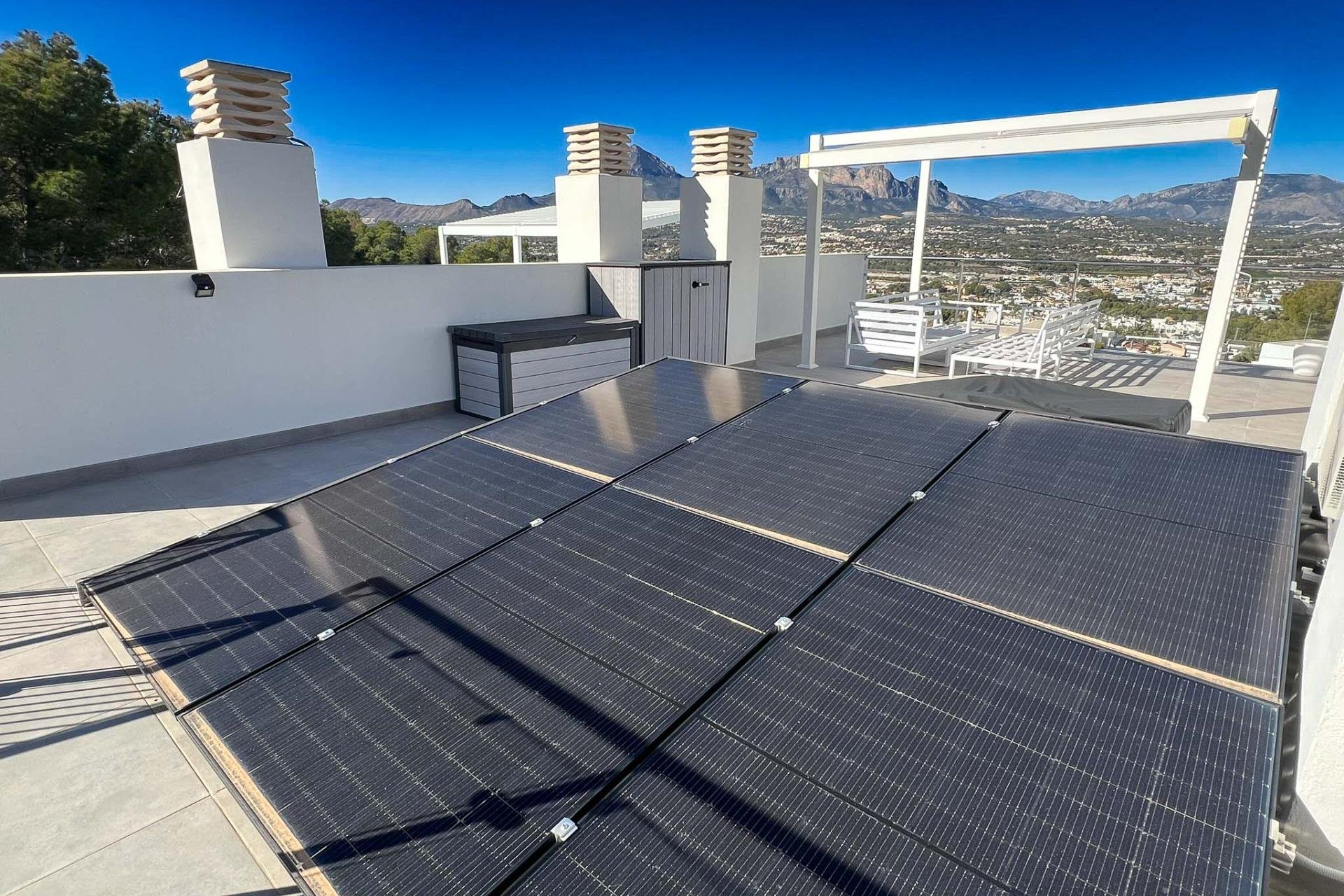 Descubre este impresionante adosado de reciente construcción, situado en la codiciada zona del Albir. Con una distribución excepcional a lo largo de tres plantas y un espectacular solárium desde el que podrás disfrutar de vistas hacia la montaña así como a la bahía del Albir y Altea. En su planta baja se encuentra un garaje privado junto a lavadero y baño; mientras que la planta primera alberga dos acogedores dormitorios, uno de ellos equipado con vestidor propio y ambos con baño en suite. La segunda planta ofrece un espacioso salón-comedor conectado a una moderna cocina abierta, además de contar con dos terrazas ideales para disfrutar del clima mediterráneo al aire libre, así como de un aseo. El ascensor privado proporciona acceso directo entre las distintas alturas facilitando el desplazamiento por toda la vivienda. Equipado también con climatización mediante splits individuales e instalaciones sostenibles gracias a sus placas solares, este adosado garantiza confort durante todo el año sin descuidar tu bienestar económico ni ambiental. Complementa tus jornadas estivales aprovechando los espacios comunes que incluyen piscina comunitaria perfecta para relajarse bajo el cálido sol español.