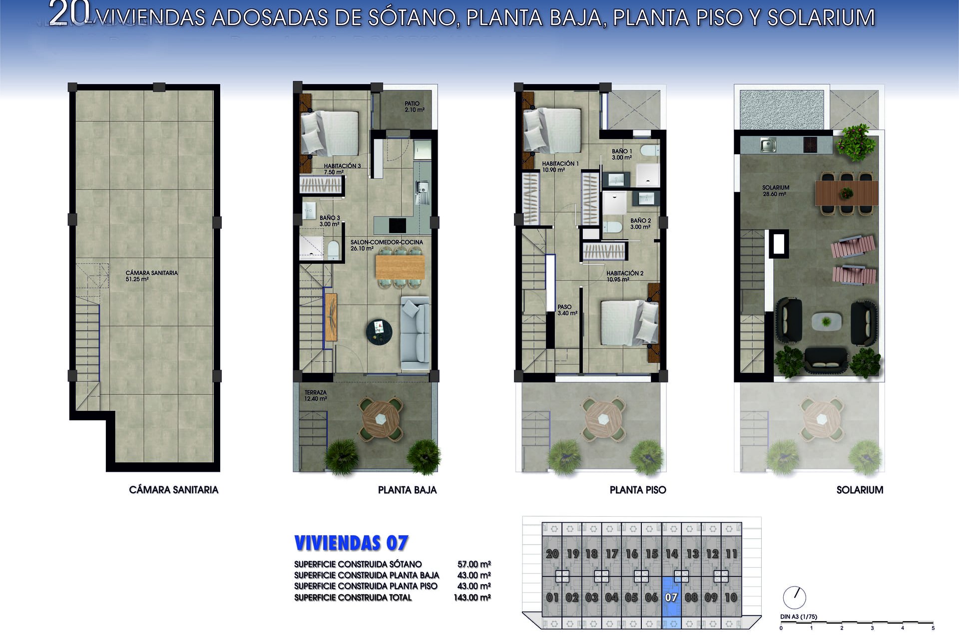 Les extérieurs de ces maisons mitoyennes à Dolores sont pensés pour maximiser le plaisir du climat méditerranéen. Chaque logement dispose d'une terrasse privée, un espace parfait pour profiter de moments en plein air, que ce soit pour se détendre, partager avec des amis ou simplement profiter d'un dîner sous les étoiles. De plus, le solarium est une caractéristique remarquable, offrant un espace supplémentaire pour bronzer ou créer un petit jardin urbain. L'architecture extérieure s'intègre harmonieusement à l'environnement, offrant un design moderne qui complète la beauté naturelle de la région.