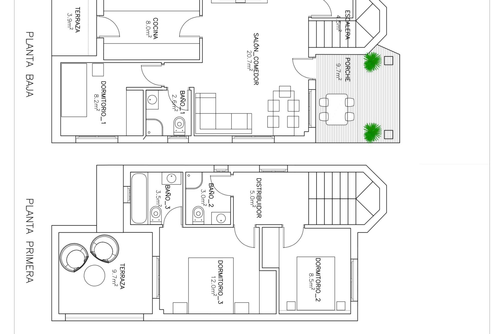 Les extérieurs de ces maisons indépendantes à San Fulgencio sont conçus pour maximiser le plaisir du climat méditerranéen. Chaque propriété dispose d'un jardin privé, parfait pour créer un espace vert personnel ou pour profiter d'activités en plein air. De plus, les terrasses spacieuses permettent de profiter pleinement des vues et de l'environnement, offrant un lieu idéal pour se détendre ou recevoir des invités. L'inclusion d'un solarium privé est une caractéristique remarquable, offrant un espace supplémentaire pour bronzer et profiter des vues panoramiques.